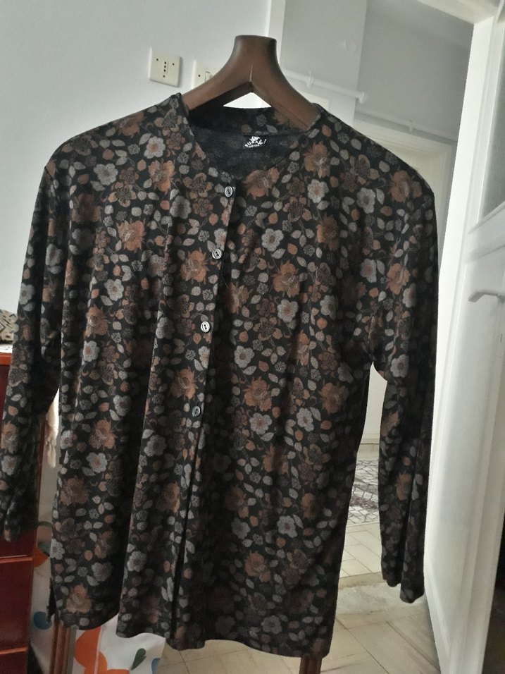 Kahverengi desenli, düğmeli, uzun kollu, normal boyda ve bol kesim kadın bluz. Günlük rahat kullanıma uygundur.