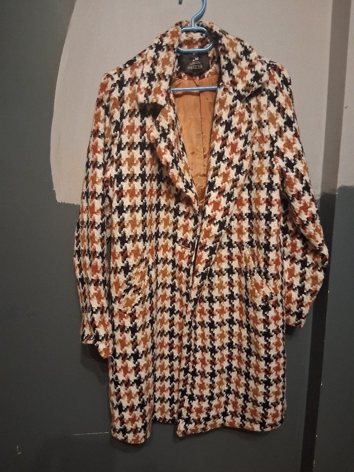 Düğmeli, kahverengi desenli uzun kaban. Diz üstü yumuşak, regular fit ve uzun kollu, günlük kullanım için uygun.