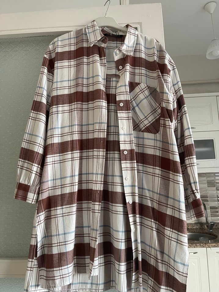 Yumuşak pamuktan, uzun kollu, düğmeli, yakalı ve bol kesim kahverengi ekose gömlek. Günlük rahat kullanım için uygundur.