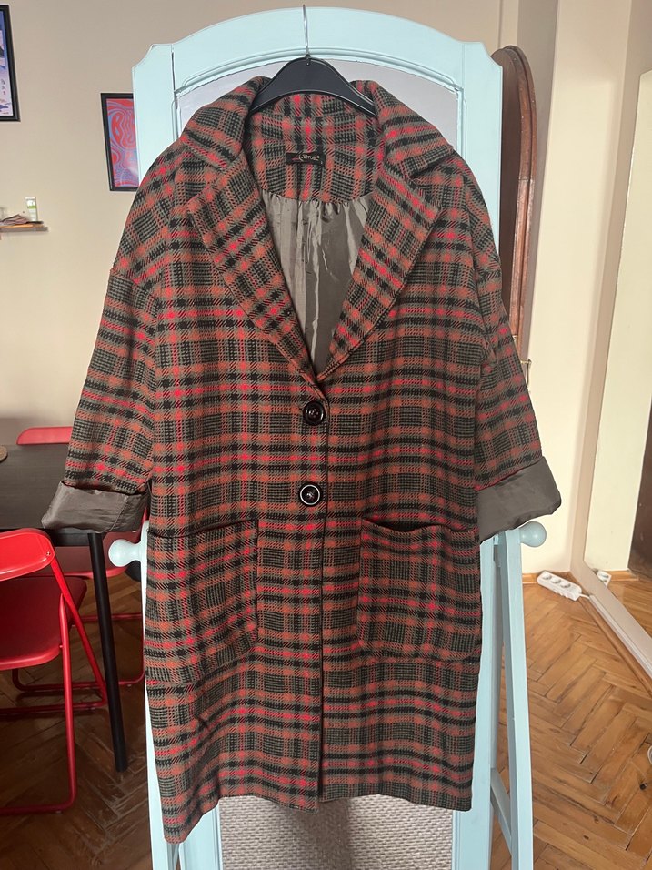 Düğmeli, kahverengi ekose desenli kaban, notalı yakalı ve uzun kolludur. midi boy ve bol kesimdir, günlük kullanım için uygundur.