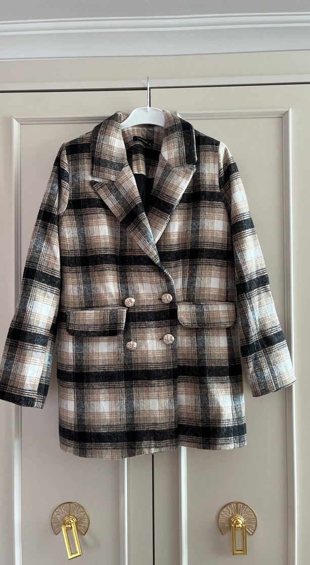 Kahverengi ve gri tonlarda ekose desenli, düğmeli, yün kumaştan yapılmış, uzun kollu, normal kesim midi uzunluğunda kadın blazer. Rahat ve sokak stiline uygun. Ürün çok az kullanıldı deformesi yok temizdir
