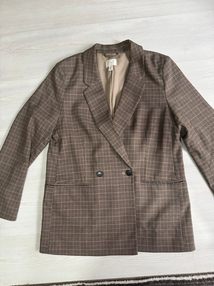 Düğmeli, kahverengi ve gri ekose oversıze ceket