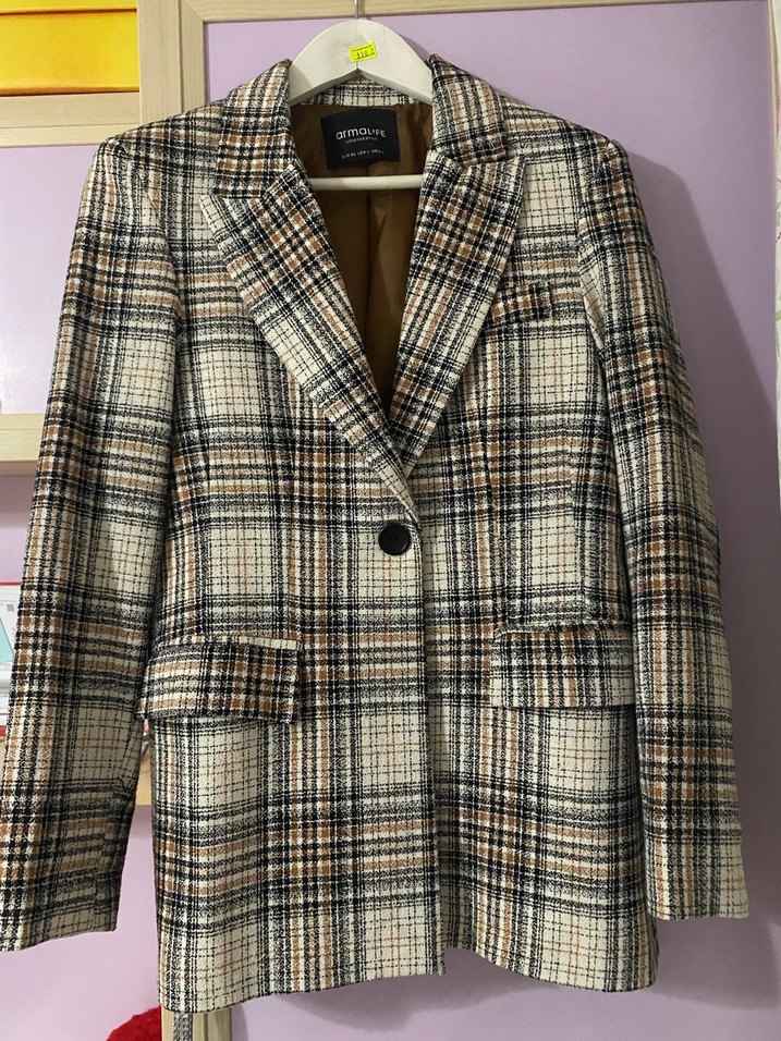 Düğmeli Kahverengi Ekose Kadın Blazer Ceket