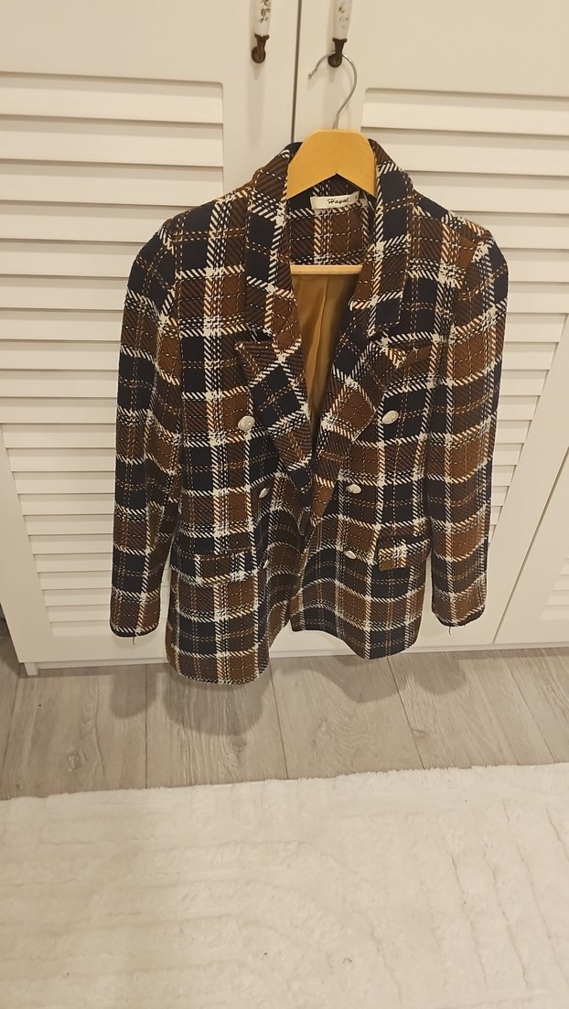 Kıslık Düğmeli, kahverengi ekose desenli kadın blazer ceket. Uzun kollu, normal kesim ve midi boyda, yünden üretilmiştir. 2 kez giyildi