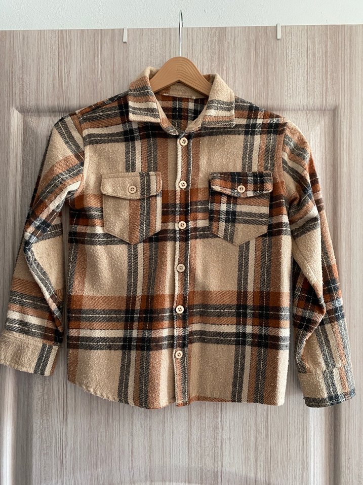 Kahverengi yün gömlek, uzun kollu ve notlu yaka detaylıdır. Açık ekose desenli, düğmeli cep ve rahat kesime sahiptir. Bohem tarz için uygun. 8,9 yaş