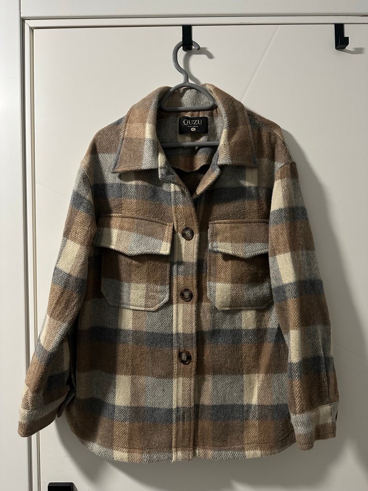 Yumuşak yün kumaştan yapılmış, düğmeli kahverengi ve gri tonlarda ekose desenli, uzun kollu ve notlu yaka detaylı rahat kesim kadın gömleği. Defosu yoktur.