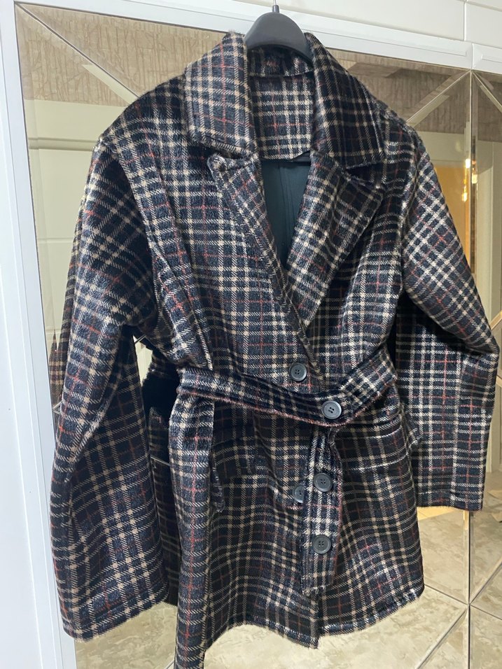 Kahverengi ekose desenli kadın kaban, düğmeli ve yaka detaylıdır. Yün kumaştan üretilmiş, rahat kesimi ve askılı kollarıyla günlük kullanıma uygundur. Marka temsili astarsız