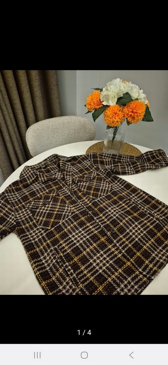 Kahverengi yünden yapılmış, ekose desenli, uzun kollu, düğmeli ve kısa kesim bohem tarzda gömlek. Rahat ve günlük kullanıma uygun.az kullanılmıs defosuz gömlek yandan cepleri vardır