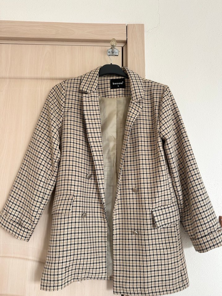 Kahverengi ekose desenli, düğmeli, notched yaka, sentetik kumaştan yapılmış, uzun kollu, normal boy midi blazer. Trendy ve günlük kullanıma uygun.