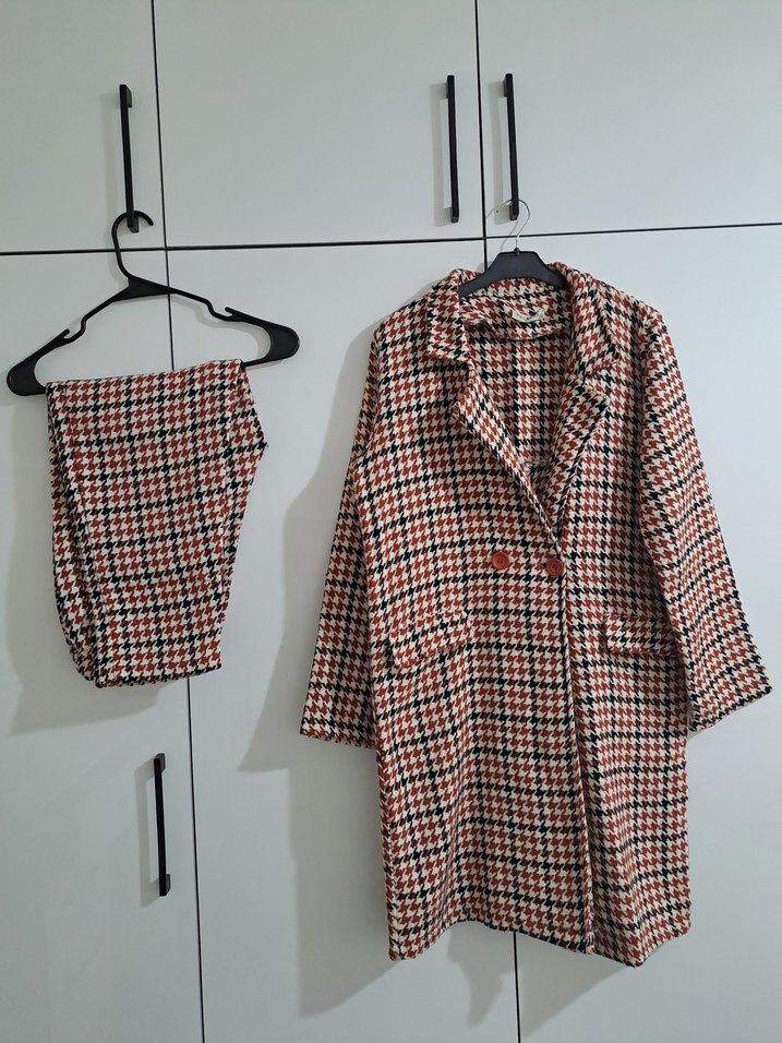 Düğmeli önü, kesik yaka ve uzun kollu bu kadın kaban takımı regular fit ve midi boydadır. Kahverengi ekose desenli tekstil kumaştan yapılmıştır. Günlük kullanıma uygun, trend bir rahat stil sunar.
