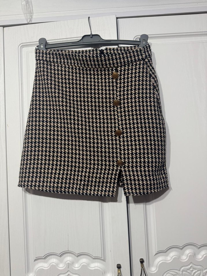 Düğmeli ve kahverengi ekose desenli, sentetik kumaştan yapılmış, dar kesim mini etek. Günlük kullanıma uygun, şık ve rahat bir sokak stili parçası.
