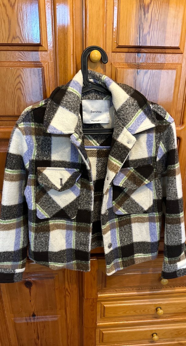 Düğmeli, uzun kollu, kısa kesim kadın ceketi. Sıcak yün kumaştan, kahverengi ekoseli deseniyle rahat ve günlük sokak stiline uygun.