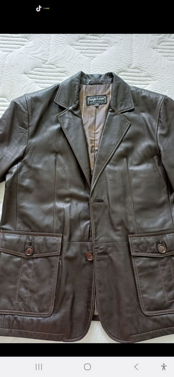 Kahverengi deri erkek ceket, düğmeli ve kesik yaka detaylıdır. Yumuşacık bir derisi vardır.Kesinlikle pişman olmayacağınız bir üründür.Mağaza satış fiyatı 10.000 tl dir.Normal kesim,hakiki kuzu derisidir.Çok tarz ve şık bir duruşu vardır. Yenidir.Sadece bir kez denenmek için giyilmistir.İki koltuk arası 55 cm. Boy 76 cm