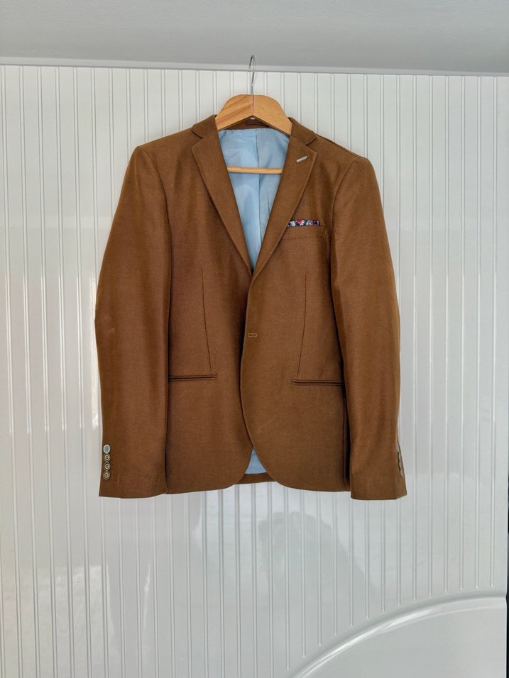 Düğmeli kahverengi erkek takım ceketi, normal uzunlukta ve regular fit kesime sahip. Parlak görünümlü, uzun kollu ve ofis ile günlük sokak stiline uygun.