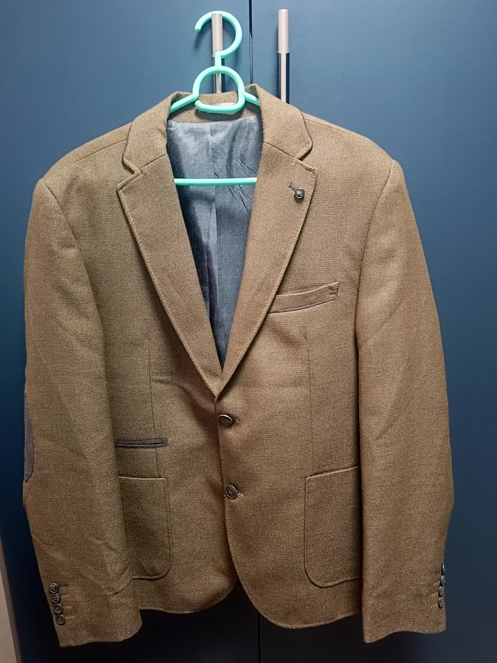 Düğmeli ön kısmı ve kesik yakası olan kahverengi erkek ceket. Regular kesim, uzun kollu ve normal boyda, ofis kullanımı için uygun.