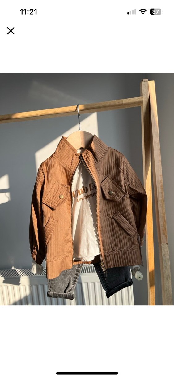 Kahverengi erkek çocuk ceketi, düğmeli ve kesik yakalıdır. Yumuşak rahat kesimle sokak stiline uygundur. 3 lü takım 6/9 ay uyumlu