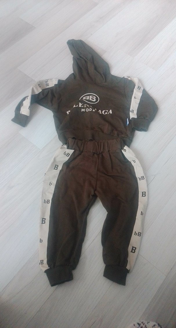 Düğmeli, baskılı yan detaylara sahip kahverengi erkek çocuk eşofman takımı. Yumuşak ve sıcak kumaştan, yuvarlak yaka ve sokak modası tarzında.