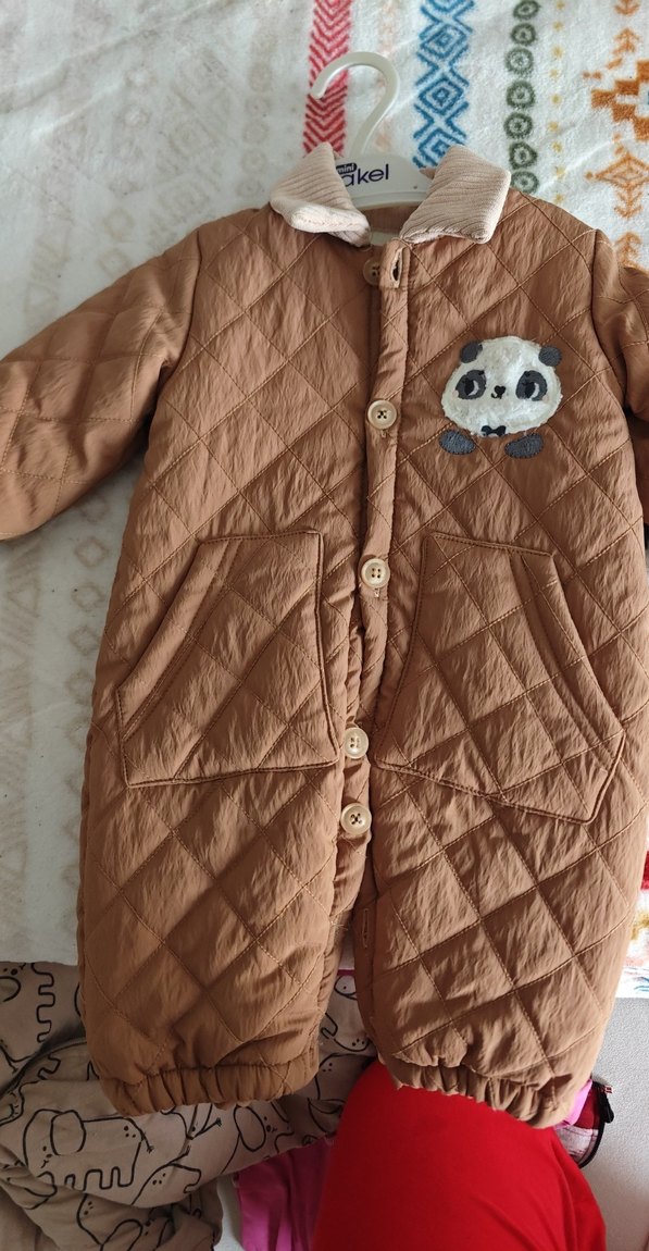 Düğmeli ve işlemeli panda desenli, notched lapel yakalı kahverengi erkek çocuk kabanı. Yumuşak ve sıcak kumaştan, dar kesim sokak stili için uygun.