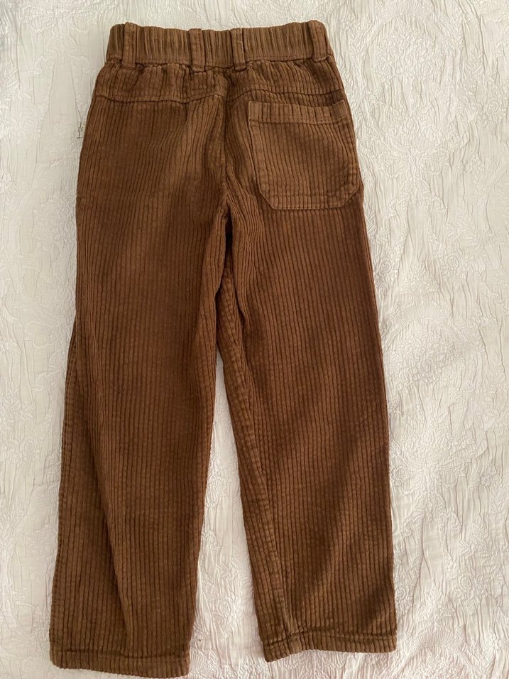 Düğmeli, tek arka cepli kahverengi keten erkek çocuk pantolonu. Rahat kesim, sade ve koyu renkte normcore tarzda.
