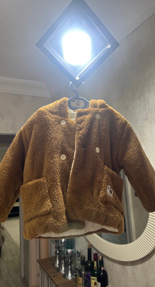 Parlak kahverengi erkek çocuk mont, düğmeli ön ve kesik yaka detayına sahiptir. Yumuşak ve sıcak kumaştan yapılmış, rahat kesimlidir ve trend sokak stiline uygundur.