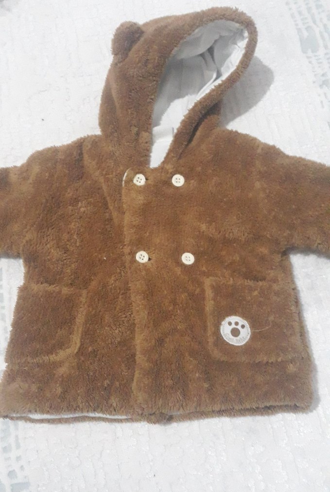 Kahverengi peluş kumaştan yapılmış, düğmeli ve kesik yakalı erkek çocuk kabanı. Bol kesim, ön ceplerde patili küçük detay bulunur. tertemiz