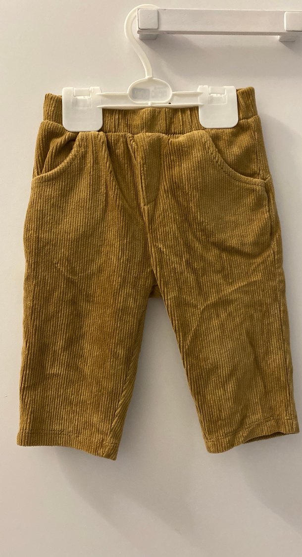 Düğmeli kapama ve düz tasarıma sahip, koyu kahverengi süet kumaştan bol kesim erkek çocuk pantolonu. Rahat ve sade stil sunar. Pantolon uzunluğu 38 cm uzunluğunda