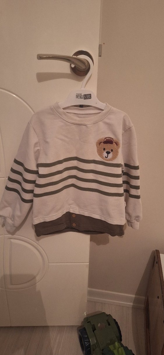 Yuvarlak yakalı, uzun kollu, bol kesim erkek çocuk sweatshirtü. Ayı desenli ve düğmeli detaylara sahip, yumuşak ve sıcak kumaştan üretilmiştir.
