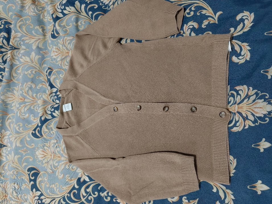 Kahverengi örme kumaştan, düğmeli ve notched lapel yakalı, uzun kollu, bol kesim çocuk hırkası. Rahat ve günlük kullanıma uygun.