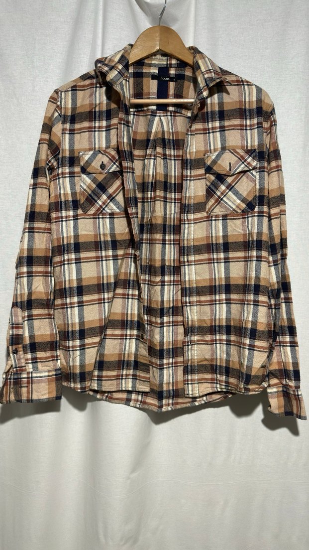 Düğmeli, uzun kollu, kahverengi kareli erkek gömleği. Rahat sokak stili için uygundur.