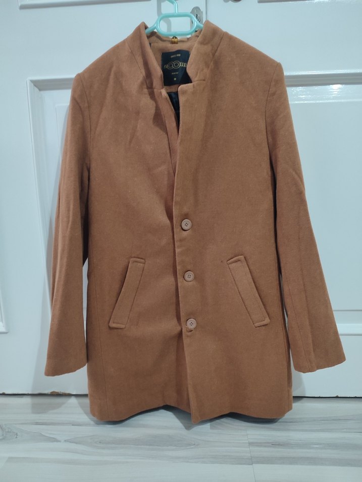 Kahverengi süet kumaştan, düğmeli, normal boy midi erkek kaban. Notch yaka ve uzun kollu, rahat kesimle günlük sokak stiline uygun.