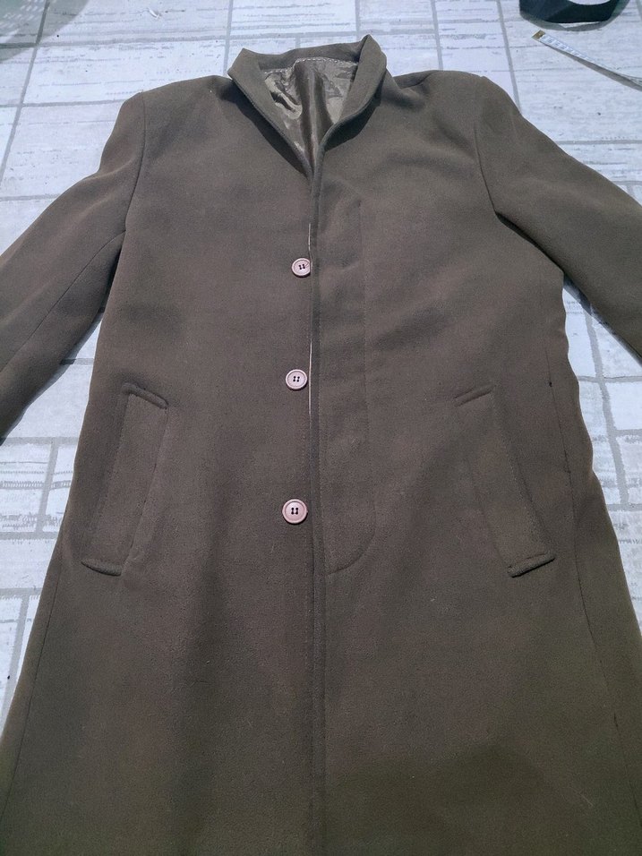 Düğmeli, notalı yakalı erkek kaban. Uzun kollu, normal kesim ve midi boyda, yumuşak ve sıcak kahverengi kumaştan. Sokak stili ve günlük kullanıma uygun. son resimde astarın alt tarafı Sökük çok iyi durumda