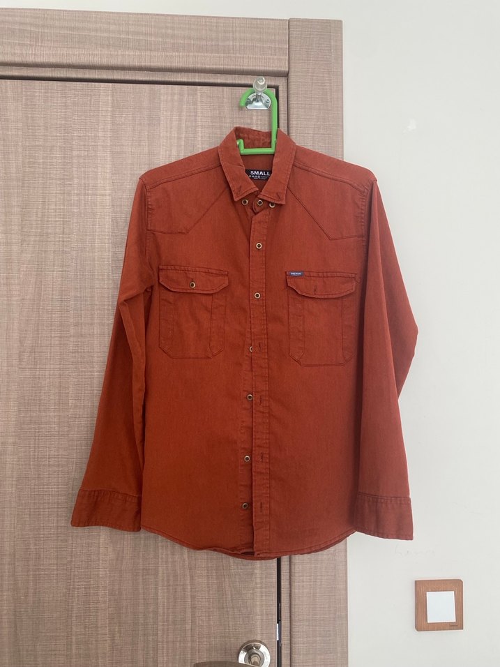 Uzun kollu, düğmeli, kahverengi parlak keten kumaştan yapılmış, normal kesim erkek gömlek. İki göğüs cebi ve yaka detaylıdır.