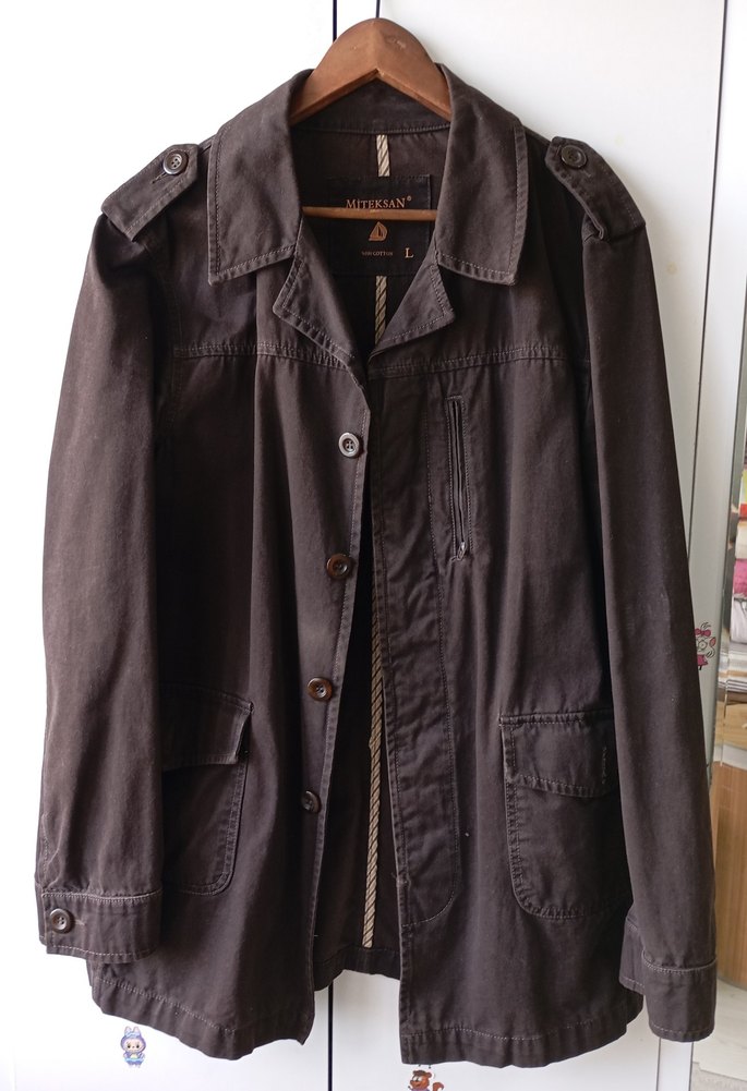Kot kumaştan yapılmış, düğmeli ve kesik yaka kahverengi erkek ceket. Salaş kesim, uzun kollu ve midi boyda, günlük sokak stili için uygun ✨