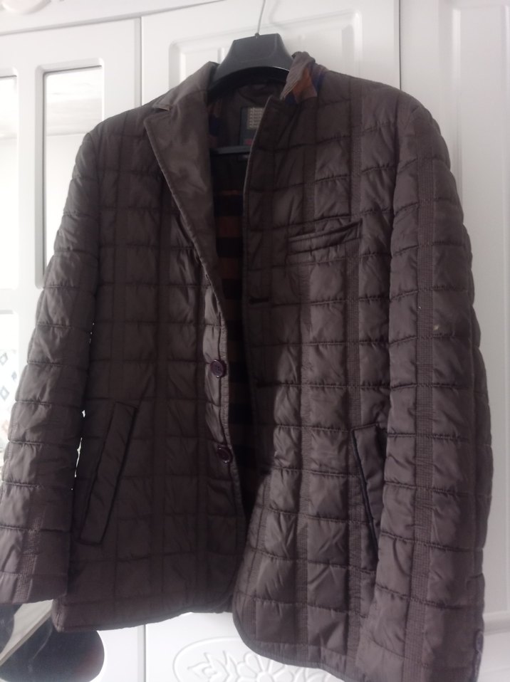 Düğmeli kahverengi erkek midi mont, kesik yakalı ve regular fit. Uzun kollu, sentetik kumaştan, günlük ve sokak stili için uygundur.
