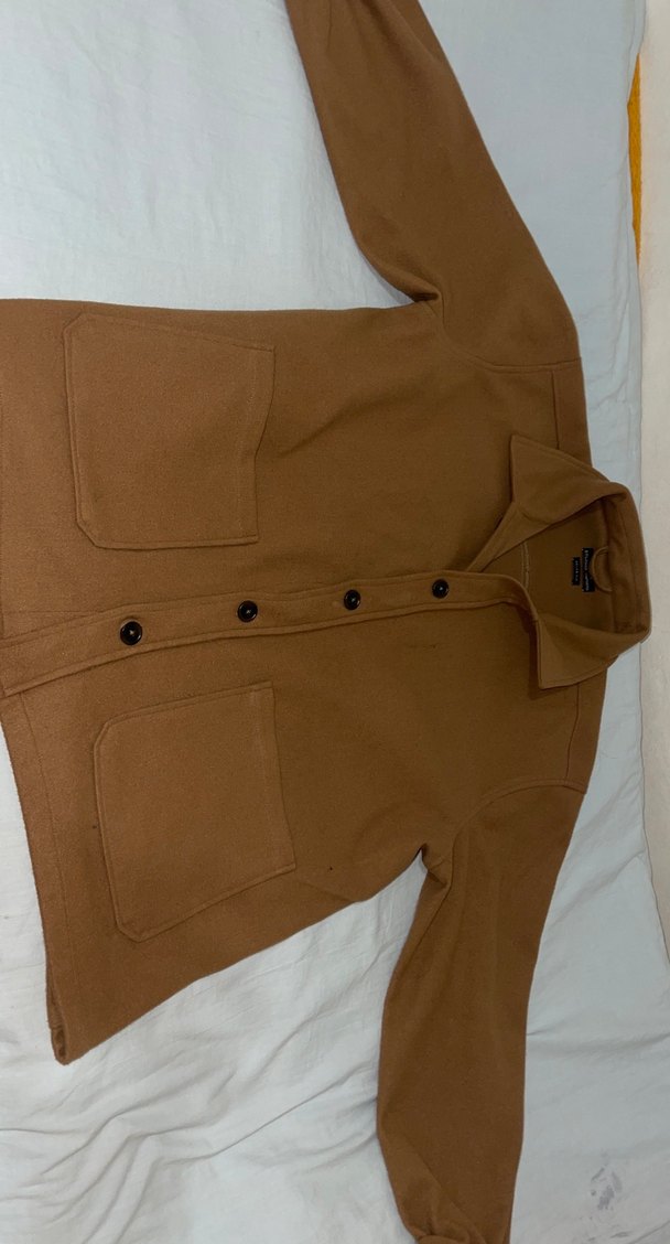 Düğmeli önü ve kesimli yakası olan, yumuşak ve sıcak kumaştan yapılmış kahverengi erkek midi mont. Rahat kesim, uzun kollu ve iki ön cepli, günlük sokak stiline uygun.