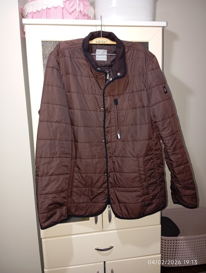 Düğmeli kahverengi erkek mont, kesik yaka ve uzun kolludur. Orta boy, rahat kesim ve yumuşak, sıcak kumaştan yapılmıştır. Günlük kullanım için uygundur.