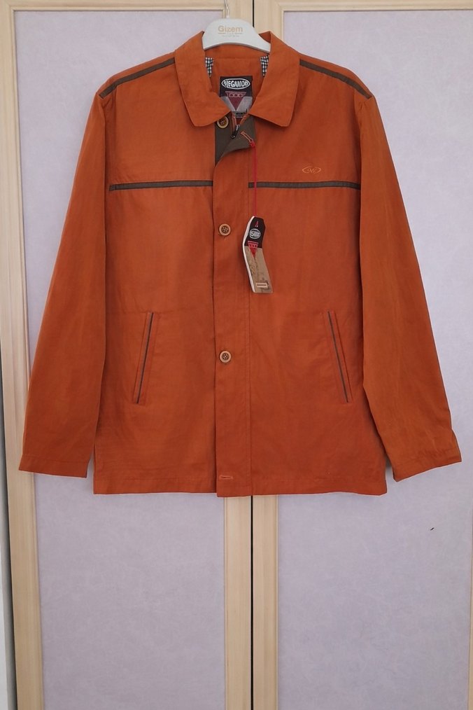 Düğmeli, kahverengi malzemeden yapılmış, erkekler için normal kesim ve uzun kollu, klasik yaka mont. Göğüs 61 Boy 74 ✨️