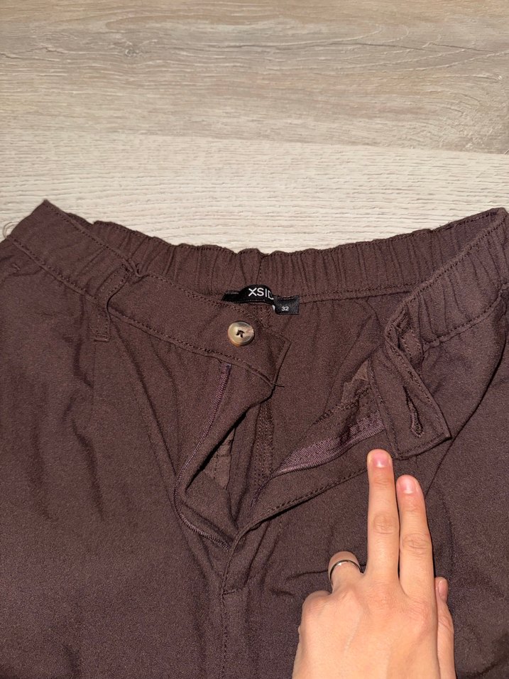 Düğmeli, kahverengi kumaştan, rahat kesim ve midi boyda erkek pantolon. Günlük sokak stiline uygun.