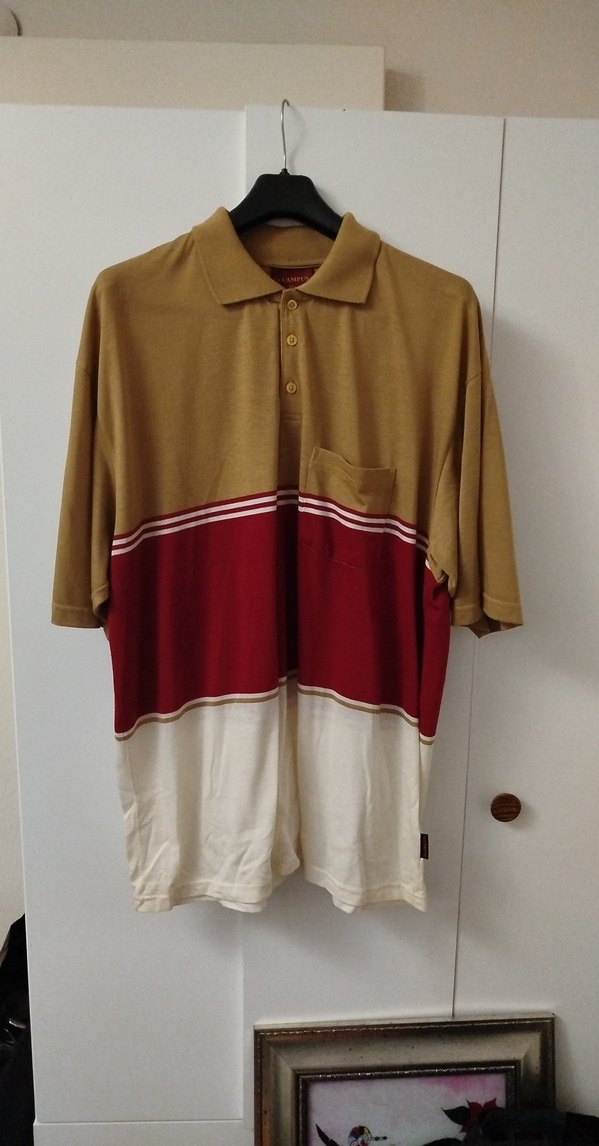 Düğmeli, kısa kollu, kahverengi, kırmızı ve beyaz renk bloklu erkek polo tişört. Cep ve yakalı tasarımıyla günlük kullanıma uygundur.