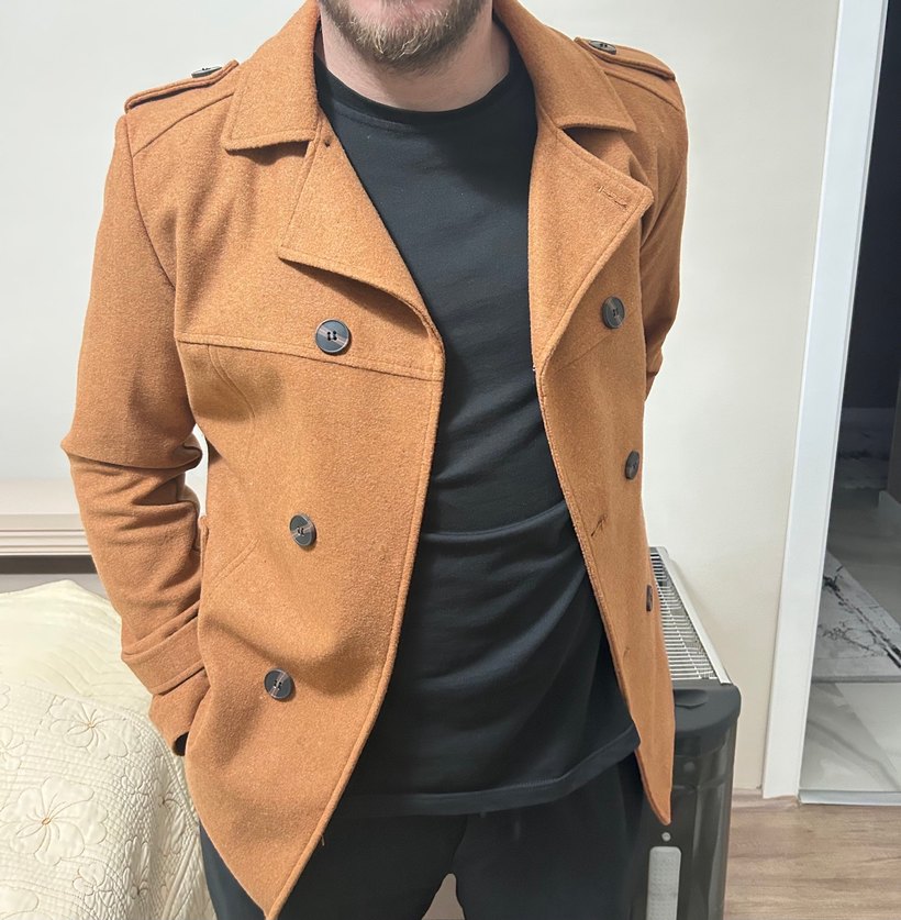 Düğmeli ön kısmı ve kesik yaka detaylarıyla kiremit erkek kaban. Normal uzunlukta ve rahat kesim, günlük kullanıma uygun. 4 kere kullanıldı