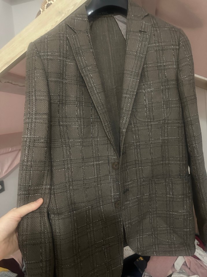 Düğmeli, kahverengi ve gri kareli desenli erkek takım elbise ceketi, normal boy ve regular fit. Uzun kollu, ofis ve günlük stil için uygun. M-L beden