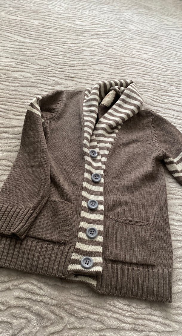 Kahverengi triko erkek hırka, uzun kollu ve bol kesimdir. Gri-kahverengi çizgili yakası ve düğmeli önü ile iki cep bulunur.