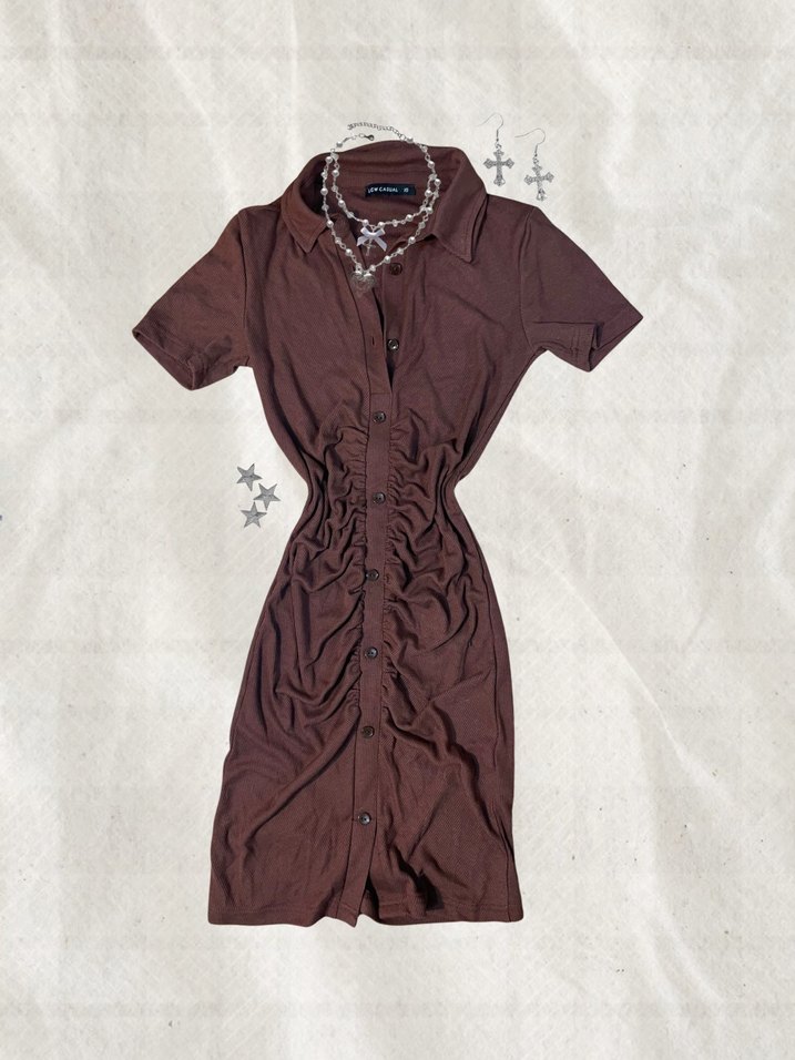 Düğmeli Kahverengi Kısa Kollu Fit Elbise
