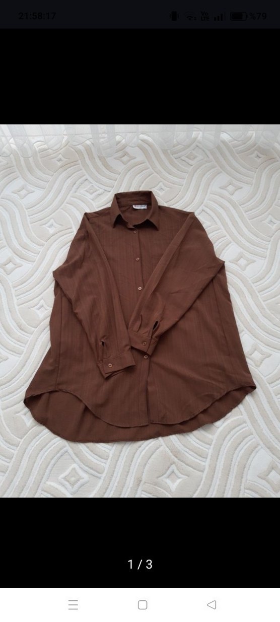 Kahverengi gömlek, uzun kollu, yakalı ve düğmeli. Bol kesim ve midi boyda, günlük kullanıma uygun.