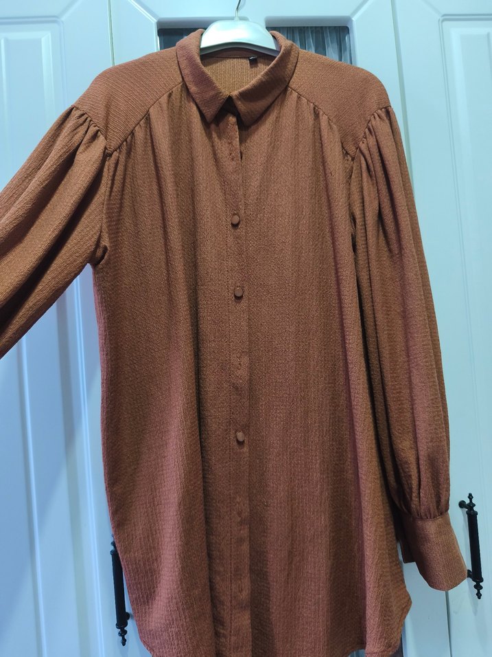 Kahverengi gömlek, yakalı ve uzun kolludur. Yumuşak keten kumaştan üretilmiş, düğmeli ön kısmı ve rahat midi boyuyla günlük kullanım için uygundur.