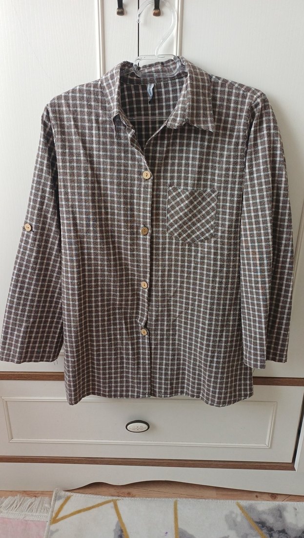 Düğmeli, kahverengi gömlek, kesik yaka ve uzun kollu. Yumuşak keten kumaştan, günlük kullanım için rahat kesim ve sade bir tarz sunar.