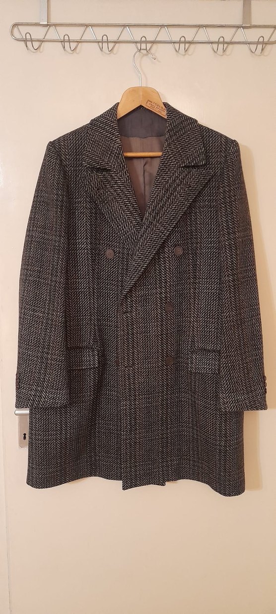Erkek yün kaban, düğmeli ön, uzun kollu ve normal kesimdir. Midi boyda, klasik sokak tarzında ve ofis için uygundur. American Vintage # italyan Vintage palto# midyum#