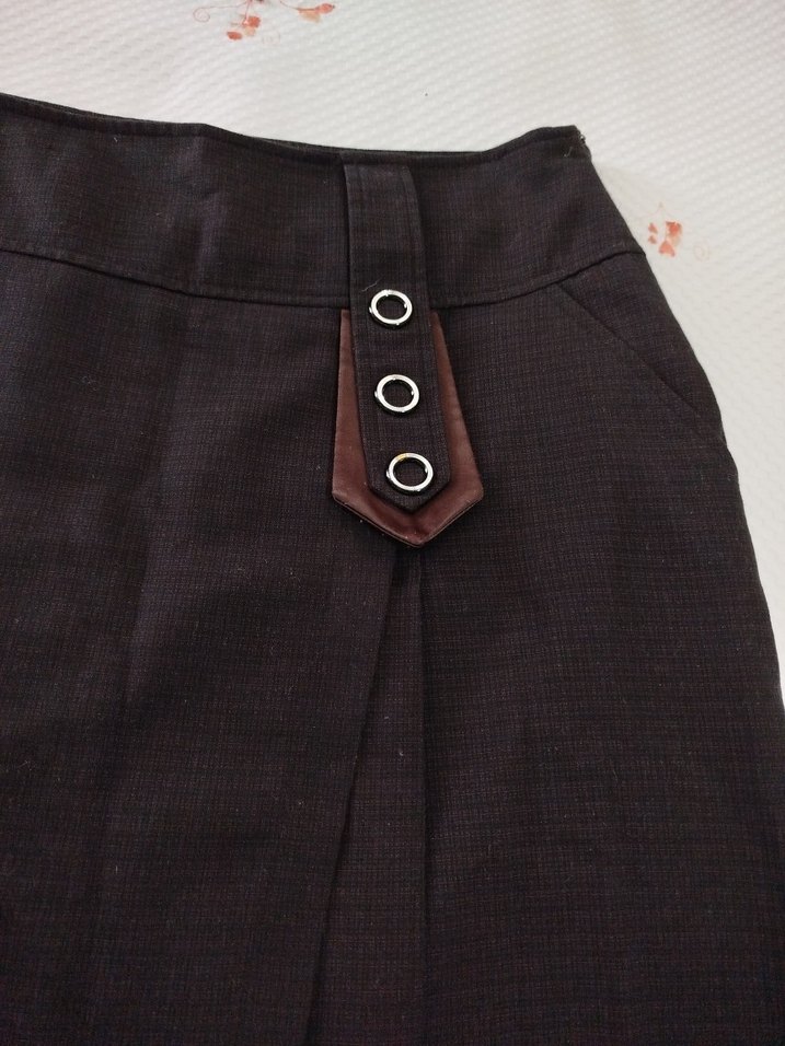 Kahverengi hamile midi etek, düğmeli detaylı, sentetik kumaştan ve ofis kullanımı için uygun, regular fit. ürün sayılı kullanıldığı tertemiz sıkıntısı yok