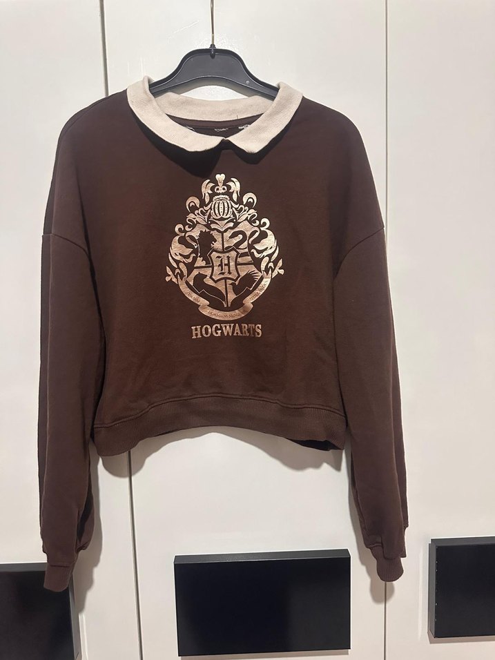 Düğmeli yaka ve uzun kollu, bol kesim kahverengi sweatshirt. Hogwarts baskılı, rahat ve şık athleisure tarzda.