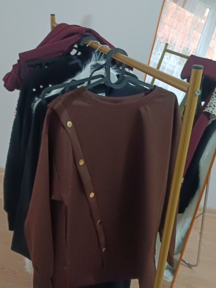 Kahverengi uzun kollu bluz, kruvaze düğmeli detaylarla ve midi boyda bol kesim, yumuşak sentetik kumaştan günlük rahat sokak stiline uygun.
